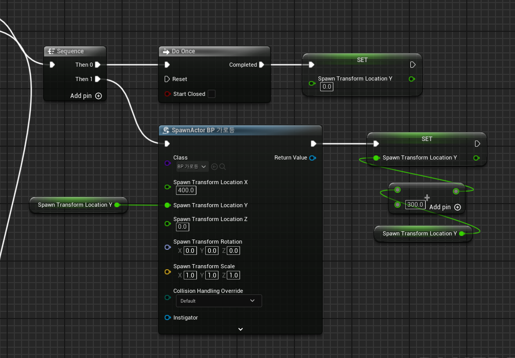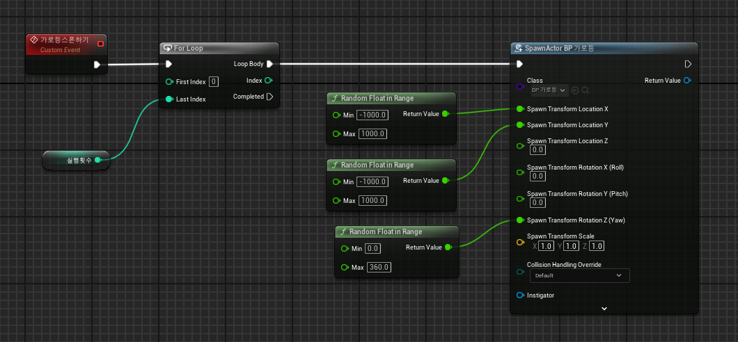 Spawn Actor from class노드는 처음에 Spawn Tansform 노드가 있는데 핀을 2번정도 분리하면 Random Float Range 노드를 연결 할 수 있다.
