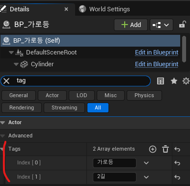 모든 액터에는 디테일창에서 Tag를 달 수 있는데, Tag를 이용해서도 액터를 묶어서 작업할 수 있다.