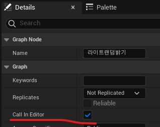 커스텀 이벤트 노드의 디테일 창에서 Call in editor를 체크하면 블루프린트 밖에서도 실행가능하도록 노출 가능.
