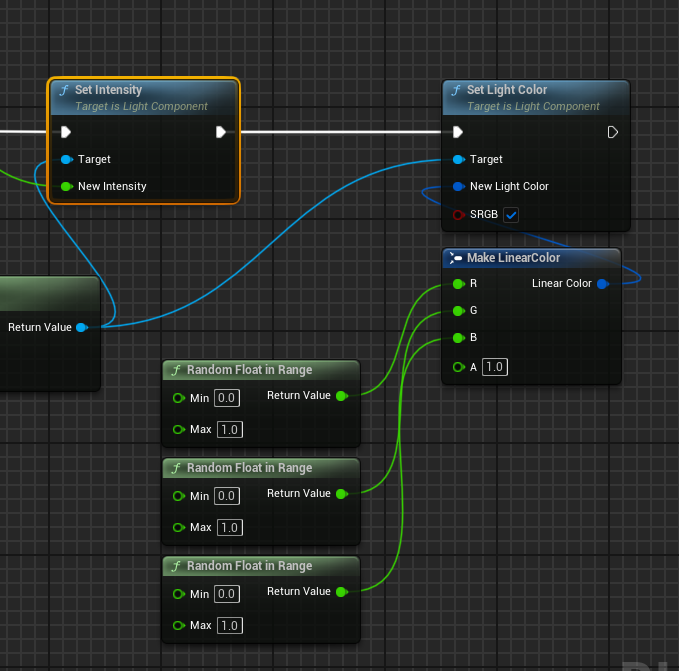 Random Float in Range 노드를 RGB용으로 3개 만들어주고 Make LinearColor 노드의 RGB핀에 각각 연결해준다.