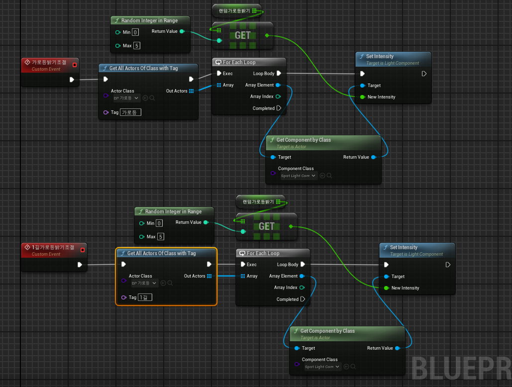 Get All Actors of Class with Tag노드의 Tag 핀에 '가로등'과 '1길'을 각각 넣어주면 해당 Tag로 구분되어 작동하는 로직을 만들 수 있다.