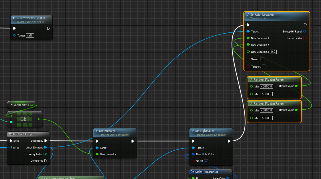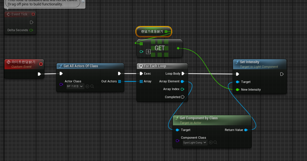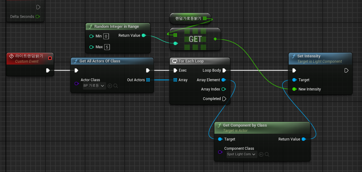 For Each Loop 노드에는 앞서 만든 가로등의 spotlight를 추출하여 밝기를 조절하기 위해 Get Component by Class로 각 액터 블루프린트마다 spotlight를 찾아주고 Set Intensity를 달아 라이트 밝기를 조절할 수 있다.