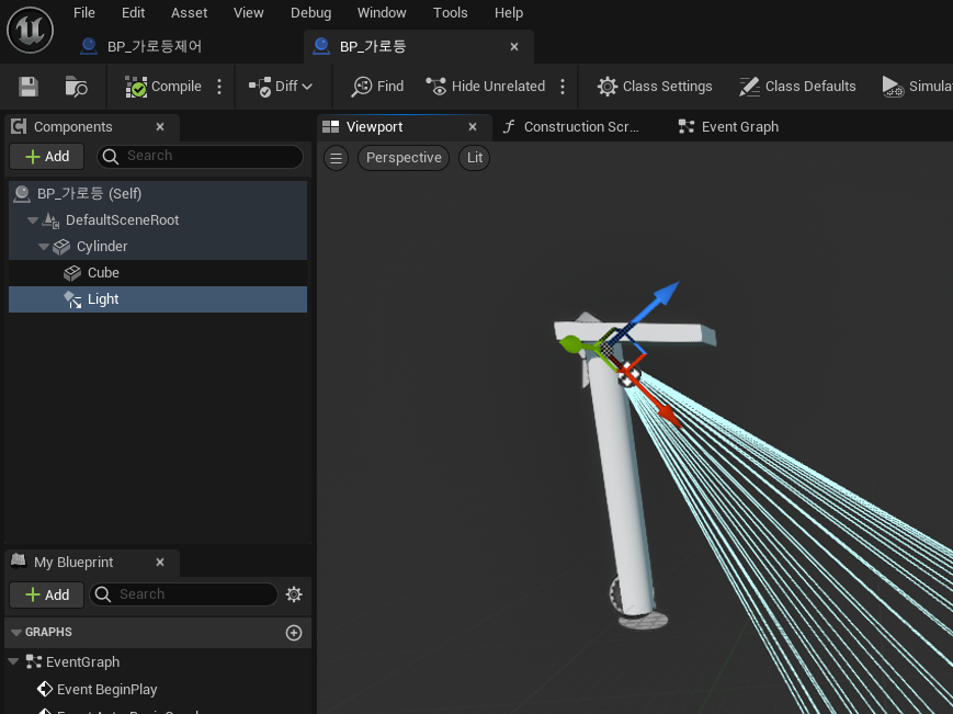 먼저 Spotlight가 들어있는 가로등 형태의 액터 블루프린트를 만들어준 후 컴파일 저장. BP_가로등