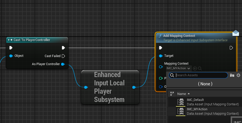 Cast to PlayerController에서 실행핀을 뽑아 Add Mapping Context노드를 연결해주고 Mapping Context에 앞서 만든 IMC_MYAction을 설정해주고, Target에는 Enhanced Input Local Player Subsystem을 연결해준다.