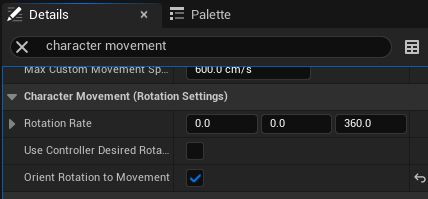 캐릭터 무브먼트의 디테일에서 character movement (rotation setting) 값에서 Orient rotation to movement 값을 활성화해준다.