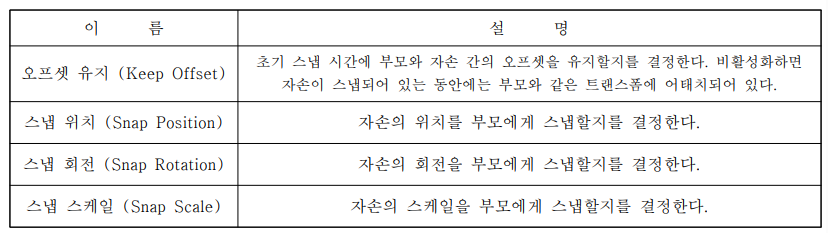부모 컨스트레인트 : 부모 컨스트레인트는 계층형으로 어태치된 것처럼 모든 축과 채널을 따라 부모에 오브젝트를 제한한다. 기본적으로, 스케일은 부모 컨스트레인트에 포함되지 않는다. 스케일을 포함하려면 컨스트레인트 항목을 RMB 하고 스케일링(Scaling) 을 활성화한다.