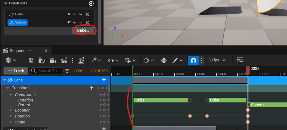 Constraints 설정 시 자식되는 어셋은 시퀀스에 자동 추가되고, Transform 트랙에 Constraints 프로퍼티가 생성되게한다. Constraints를 끄고 키는 것도 시퀀스에서 Key를 주어서 해줄 수 있다. ( key 버튼은 Constraints에 있는 버튼으로 넣어주어야한다.