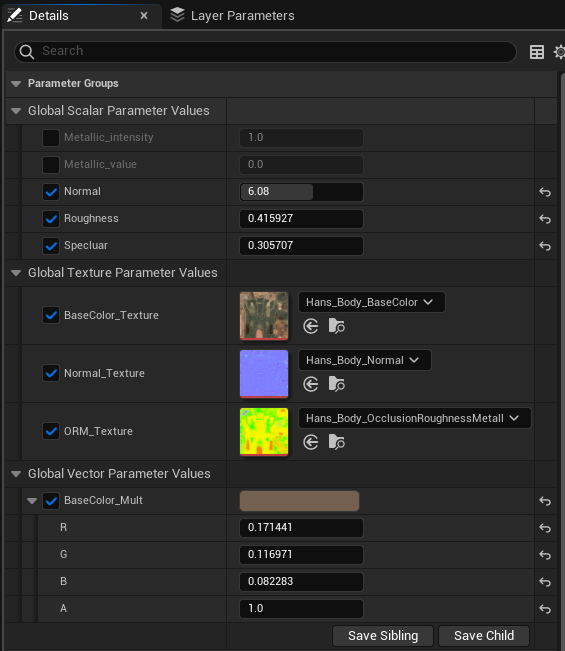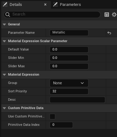 메터리얼 그래프에서 파라미터화( Convert to Parameter ) 한 노드들은 메터리얼 인스턴스 디테일 패널에 노출되어 조절이 가능해진다
