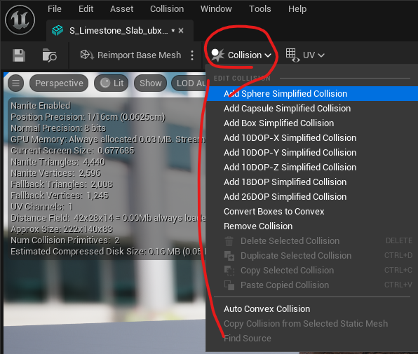 에셋 자체에 콜리전을 설정하기 위해서는 에셋 에디터에서 추가해 줄 수 있다
