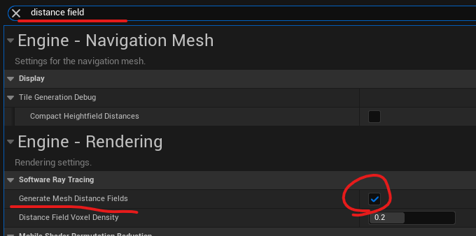 software Ray Tracing탭 - Generate Mesh Distance Fields 켜져 있는지 확인