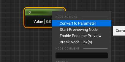 메터리얼 그래프에서 노드를 우클릭 - Convert to Parameter를 통해 가능하다
