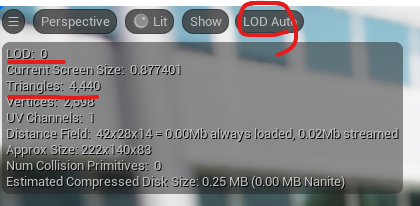 LOD Auto로 설정되어 있다면 뷰포트에서 차지하는 영역이 적어질 수록 LOD값이 점점 커지며 자동으로 바뀐다