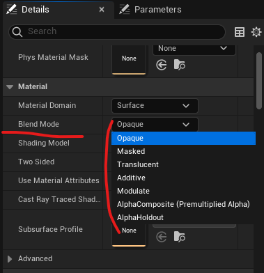 V 머테리얼 에디터의 디테일패널에서 Blend Mode는 재질에 따라 변경을 하게 된다