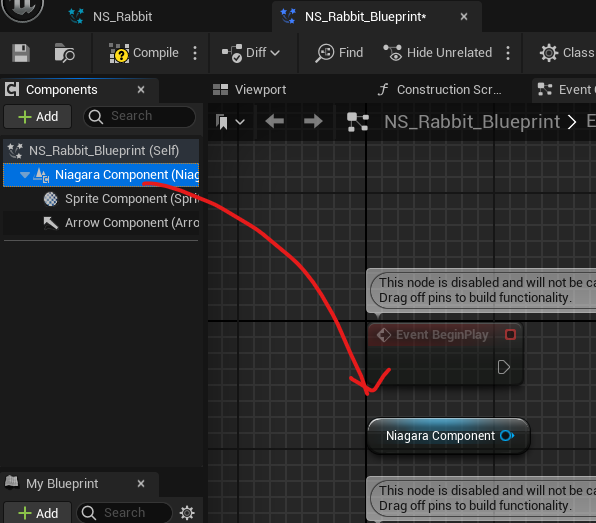 블루프린트에 들어가서 이벤트 그래프에 Niagara Component를 드래그 드롭