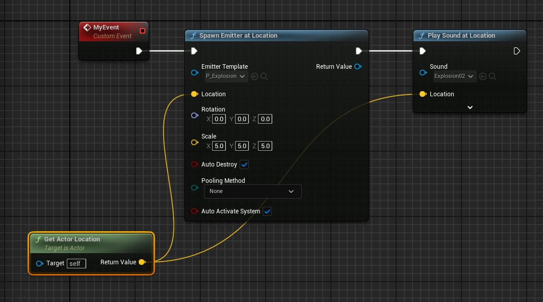 Spawn Emitter at Location 다음으로 Play Sound at Location을 연결해주고,