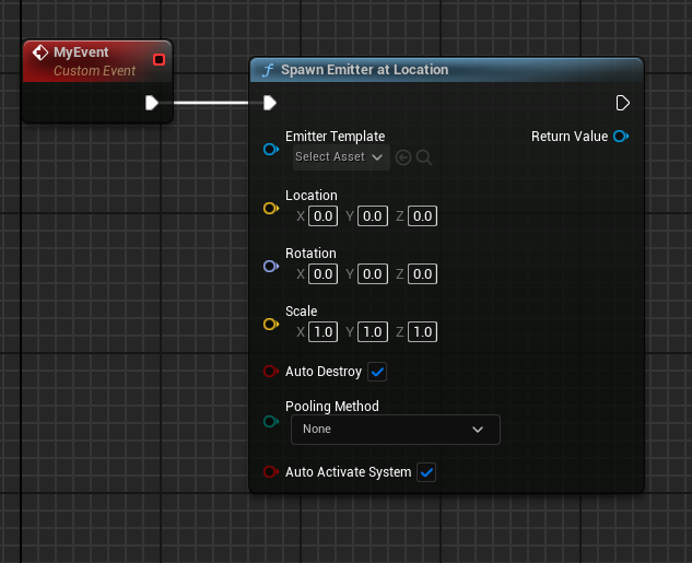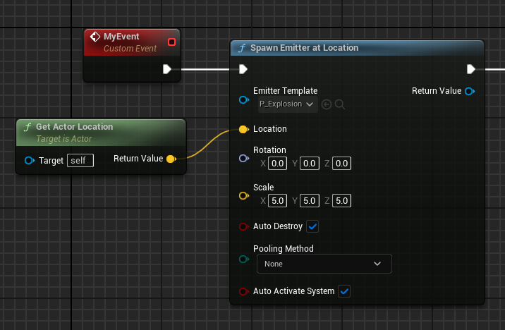 Get Actor Location을 달아 Spawn Emitter at Location의 Location에 연결.
