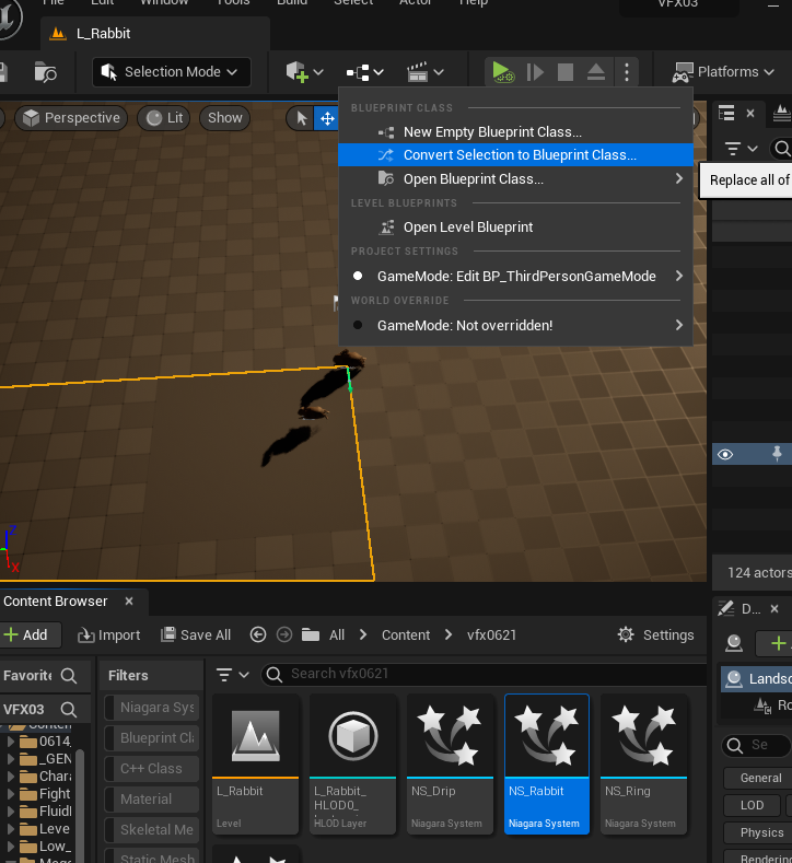 레벨에 올라간 나이아가라를 선택하고 상단의 블루프린트 아이콘을 눌러 '선택을 블루프린트 클래스로 변환'을 선택해준다.