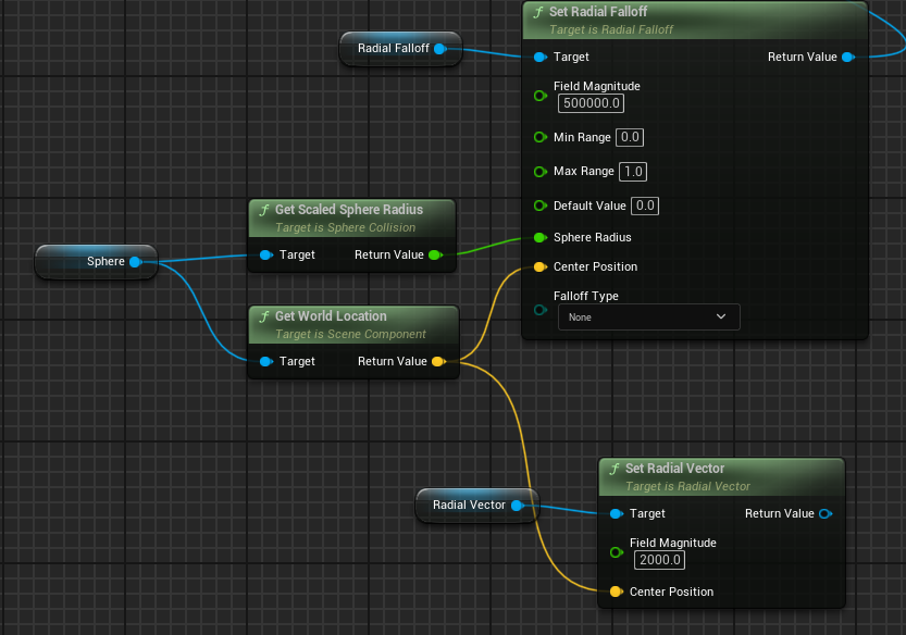 Get World Location을 얻어 Set Radial Falloff의 Sphere Radius, Center Position에 각각 연결해준다.