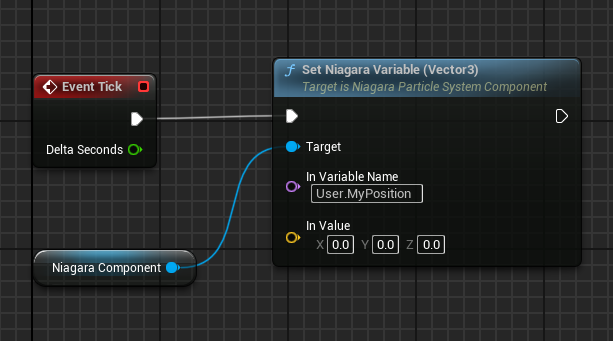Event Tick의 실행핀과 앞서 불러온 Niagara Component도 연결해주고,