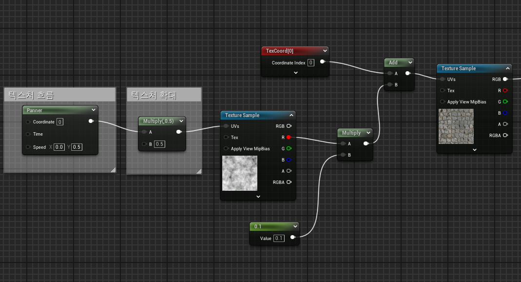 Panner - 일정한 속도로 움직이도록 설정하는 노드(흘러가는 전광판이나 페이크로 물을 표현할 때 사용할 수 있을 것 같다)