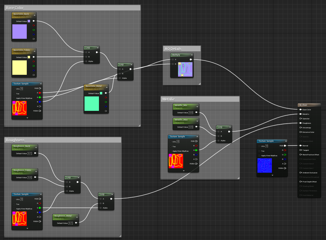 베이스컬러 이외의 다른 맵이나 수치가 같은 방식으로 제작 가능하고, 앰비언트 오클루전 맵같은 경우에는 Multiply(단축키 M + 클릭) 노드를 이용하여 BaseColor의 마지막에 곱해주어 디테일을 더해줄 수 있다