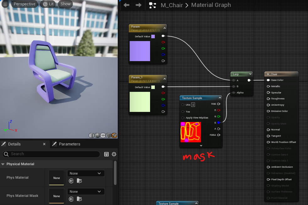 [대표적인 언리얼 머티리얼의 유형] 1. 실제 구현을 위한 머티리얼 2. 이펙트를 위한 머티리얼 [머티리얼 제작 기초] Constant3Vector - 단축키 3 + 좌클릭 Lerp(LinearInterpolate) - 단축키 L + 좌클릭 TextureSample - 단축키 T + 좌클릭 Lerp는 Alpha가 0일 때 A값을 Alpha가 1일 때 B값을 뱉어낸다. 0과 1 중간값일 경우에는 A와 B값을 블랜딩해주는 결과값이 나온다 그래서 Alpha값에 Mask 맵을 넣어주면 메시 부위별 다른 컬러 세팅이 가능해진다 Lerp 설정 시 순서가 중요, 포토샵과 같이 A값 위에 B값이 섞이는 것이기 때문에 베이스가 되는 컬러부터 위에 쌓이는 컬러 순서를 생각하며 작업하여야한다 * 머티리얼 에디터 뷰포트에서 ..